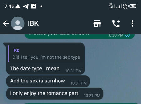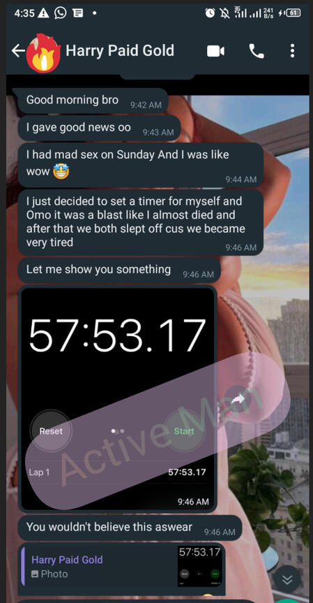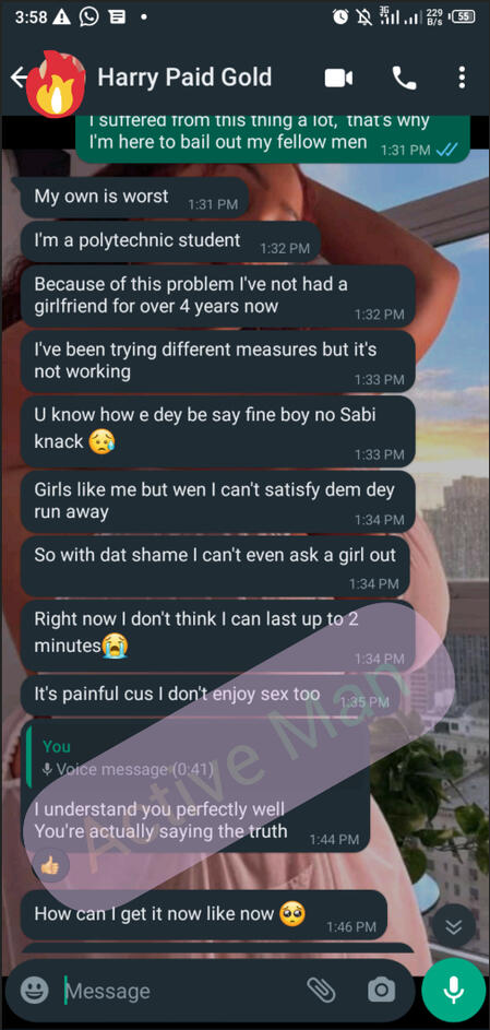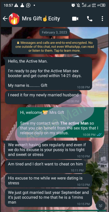 I understand how frustrating it is to be a 2-minute man, I've experienced it.Before I got to know this solution, I suffered a lot of embarrassment due to my inability to satisfy my woman in bed. It has been a major concern for me both day and night.Let me show you the chats my babe had with me that triggered me to spring into action๐