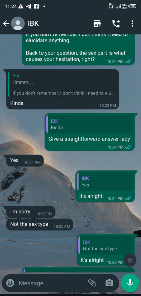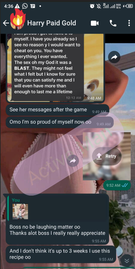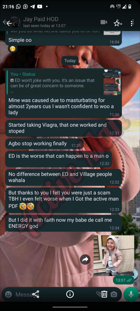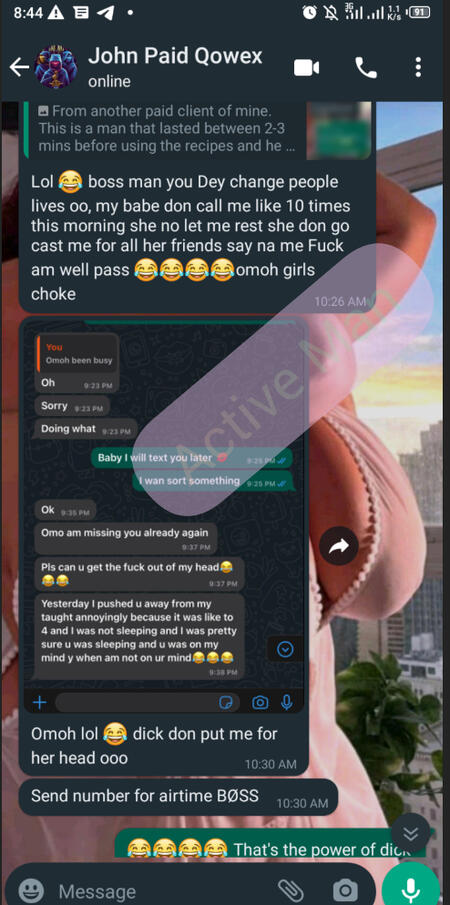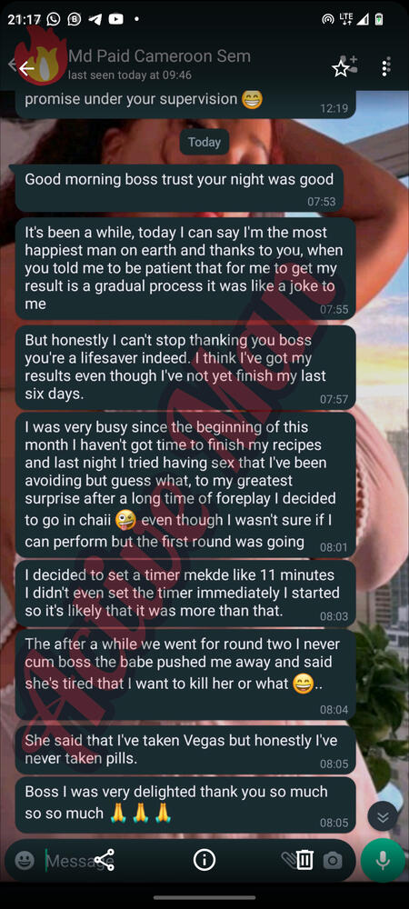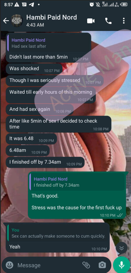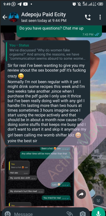 I understand how frustrating it is to be a 2-minute man, I've experienced it.Before I got to know this solution, I suffered a lot of embarrassment due to my inability to satisfy my woman in bed. It has been a major concern for me both day and night.Let me show you the chats my babe had with me that triggered me to spring into action๐